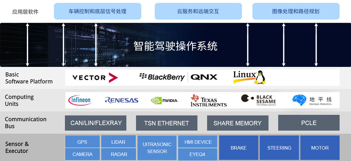面向多源异构计算平台,应用数据流引擎和可插扩算法引擎对多内核操作系统进行封装,实现硬件平台和应用开发的双解耦,并集成环境感知、融合定位、规划决策、控制执行、网联云控等共性基础组件,可以有效支撑高效、低成本、定制化的智能驾驶应用开发。